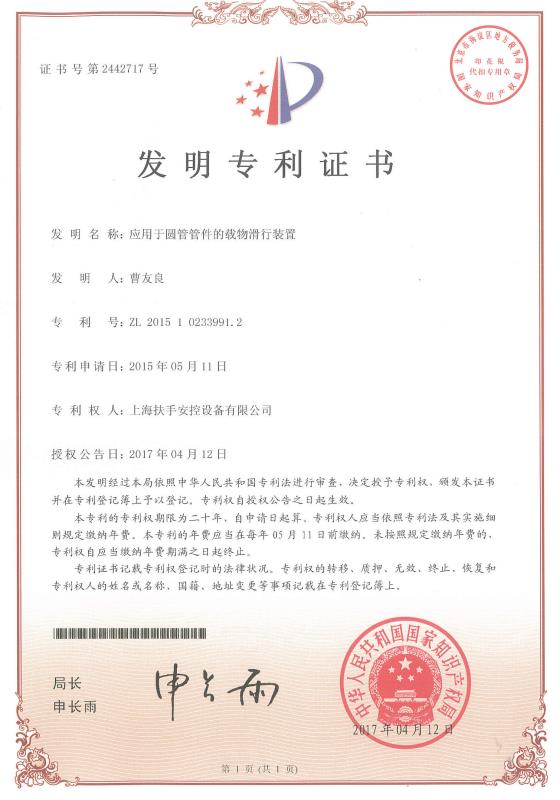 [资质荣誉] 实用新型专利证书-圆管管件的载物滑行装置 日期:2019-03-22 14:32:54 点击:141 好评:0