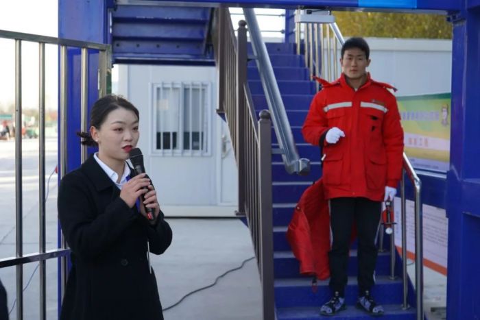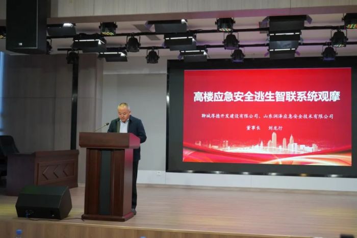聊城厚德开发建设有限公司董事长刘龙行就本次会议致结束语。他表示高层建筑应急安全逃生一直是个大难题,聊城厚德开发建设有限公司先行先试,大胆创新,开发建设的市级重点项目--聊城应急安全科创谷,安装“高楼应急安全逃生智联系统”,为山东省新建项目第一。希望通过此次观摩,打造一个帮助我们更加深入认识高层建筑安全重要性的平台,也让我们亲眼见证“高楼应急安全逃生智联系统”的高效便利性。